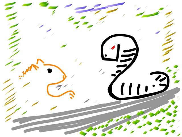 La astuta serpiente se desliza por una gruesa rama, a pocos metros de la pequeña cueva; el pelaje de la ardilla se halla completamente erizado por el temor, coloca su cuerpo por sobre el de sus pequeñitas creaciones en un intento infructuso por protegerlas… Pero en ese momento sucede un hecho inédito, más allá de toda comprensión racional. El macho ardilla salta sobre la rama desde una posición superior, interponiéndose entre el predador y la madriguera, dispuesto a la lucha. El desenlace no tiene sorpresas, pero mientras el reptil devora al macho, la hembra tiene el tiempo suficiente para mudar las crías a un nuevo orificio en un lugar lejano, puesto que si no lo hace la serpiente volverá por la misma ruta cuando vuelva a sentir el hambre. El sacrificio del macho le permite la huída perfecta salvando a sus pequeñitos.