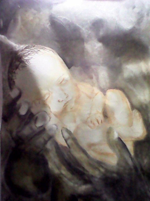 Esta pintura que me llega desde Paraguay me ha parecido excepcional; pertenece a la artista plástica Carolina Bernardi. Este padre de quién sólo se ven sus manos me hace recordar a mi propio padre, de fuertes rasgos afroamericanos, quién ya hace años ha partido. Es una pintura que escenifica muy bien la acción, independiente de la imagen, tiene toda la fuerza y potencia del padre, al mismo tiempo que su amor y su cuidado.
